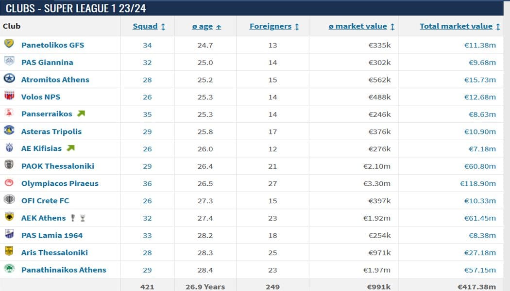 Αναλυτικά ο μέσος όρος ηλικίας των 14 ομάδων της Σούπερ Λίγκας: