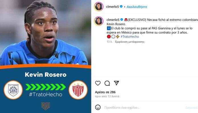 Μεταγραφικό “μπαμ” για τον Κέβιν Ροσέρο, καθώς όπως αποκαλύπτει ο δημοσιογράφος Σέζαρ Λουίς Μέρλο, που αποκάλυψε και τη μεταγραφή του Πόνσε στο MLS, ο Κολομβιανός μεσοεπιθετικός παίρνει μεταγραφή στο Μεξικό και την ομάδα της Νεκάξα, που αγωνίζεται στην Α’ κατηγορία.