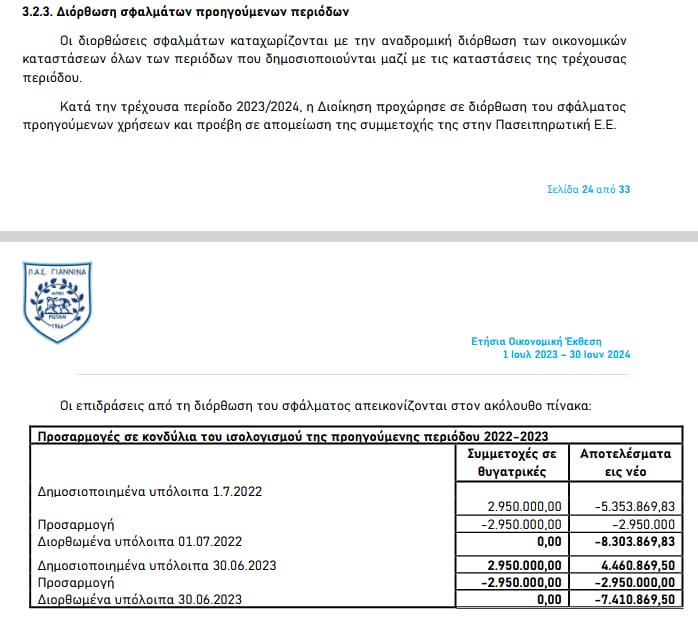 Δημοσιεύτηκε ο ισολογισμός της ΠΑΕ ΠΑΣ Γιάννινα 1966, ο οποίος αποτυπώνει την οικονομική κατάσταση της εταιρείας ως τις 30/6/2024, ό,τι έχει γίνει δηλαδή όσο η ομάδα ήταν ακόμα στη Super League 1. Ακόμα και σε μία τέτοια σεζόν με εκατομμύρια έσοδα, η ομάδα βγήκε ζημιογόνα και χάθηκαν και ρυθμίσεις, καθώς μετά τον υποβιβασμό δεν είχε γίνει μέχρι τώρα εφικτή μία ευνοϊκότερη ρύθμιση, με την έκθεση του ορκωτού ελεγκτή να αναφέρει: