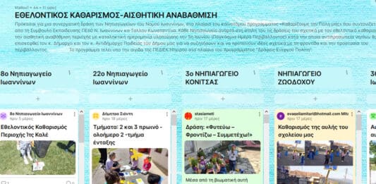 Μια ιδιαίτερα καινοτόμος πρωτοβουλία της Συμβούλου Εκπαίδευσης Νηπιαγωγών της ΔΠΕ Ιωαννίνων κας Τάλλου Κωνσταντίνας, με τίτλο «Καθαρίζουμε την πόλη μας» υλοποιήθηκε τη φετινή σχολική χρονιά με τη συμμετοχή πλήθους Νηπιαγωγείων του Νομού Ιωαννίνων. Πρόκειται για μια πρωτοβουλία με πολλαπλά οφέλη – παιδαγωγικά, κοινωνικά και περιβαλλοντικά – που αξίζει να διαδοθεί και να αποτελέσει πρότυπο για … Συνεχίστε να διαβάζετε το Καινοτόμο Πρόγραμμα Περιβαλλοντικής Εκπαίδευσης από τα Νηπιαγωγεία του Ν. Ιωαννίνων.