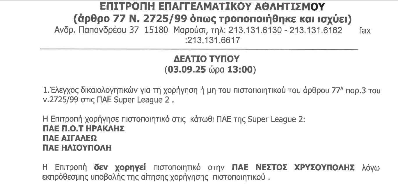 Νέες αποφάσεις για τα πιστοποιητικά συμμετοχής των ομάδων της Super League 2 εξέδωσε την Τετάρτη 3 Σεπτεμβρίου η Επιτροπή Επαγγελματικού Αθλητισμού, με τους Ηρακλή, Αιγάλεω και Ηλιούπολη να παίρνουν το πιστοποιητικό. Ωστόσο δεν κατάφερε να το πάρει ο νεοφώτιστος στην κατηγορία Νέστος Χρυσούπολης, λόγω εκπρόθεσμης υποβολής του φακέλου του!