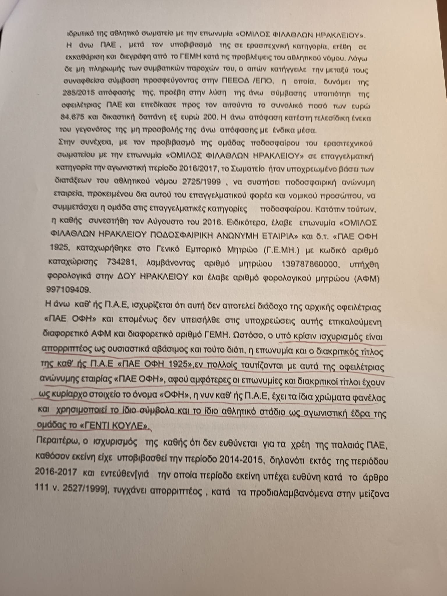 Επίσης το Διαιτητικό Δικαστήριο απέρριψε το επιχείρημα του ΟΦΗ (που κλείνει φέτος τα 100 χρόνια του), που υποστηρίζει ότι δεν έχει σχέση με την “παλαιά ΠΑΕ ΟΦΗ”, κρίνοντας ότι “εν πολλοίς ταυτίζεται με την οφειλέτρια εταιρεία” λόγω του ονόματος, του συμβόλου, των χρωμάτων και της έδρας.
