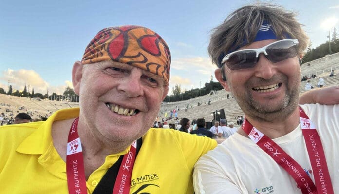 Ο φίλος, μέλος του Συλλόγου Δρομέων Ιωαννίνων και ξεναγός στον Ημιμαραθώνιο Πυραμίδων, Θεόδωρος Γκούμας, γνωστός ως Theo, περπάτησε τον φετινό 42⁰ Αυθεντικό Μαραθώνιο της Αθήνας ως συνοδός του σχεδόν τυφλού φίλου του, του Βρετανού Richard Simpson.