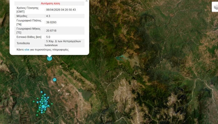 Από νέο επίκεντρο ήταν ο σεισμός που προκλήθηκε στις 7:20 το πρωί της Μεγάλης Δευτέρας στα Ιωάννινα και ήταν μεγέθους 4,3 Ρίχτερ. Έγινε κι αυτός ιδιαίτερα αισθητός, αφού σύμφωνα με την αναθεωρημένη λύση του γεωδυναμικού ινστιτούτου έγινε 6 Χλμ. Νότια και Νοτιαανατολικά των Ασπραγγέλων Ιωαννίνων. Δυτικά των Ασπραγγέλων Ιωαννίνων σε εστιακό βάθος 16,6 χλμ.