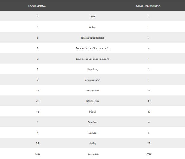 Μοιρασμένες οι τελικές προσπάθειες, αλλά από εκεί και πέρα οι αριθμοί δείχνουν λίγο καλύτερο με Παναιτωλικό με περισσότερα κλεψίματα και λιγότερα λάθη, ενώ τα πολλά άστοχα γεμίσματα έδωσε τη δυνατότητα στην άμυνα του ΠΑΣ να έχει πολλές επεμβάσεις.