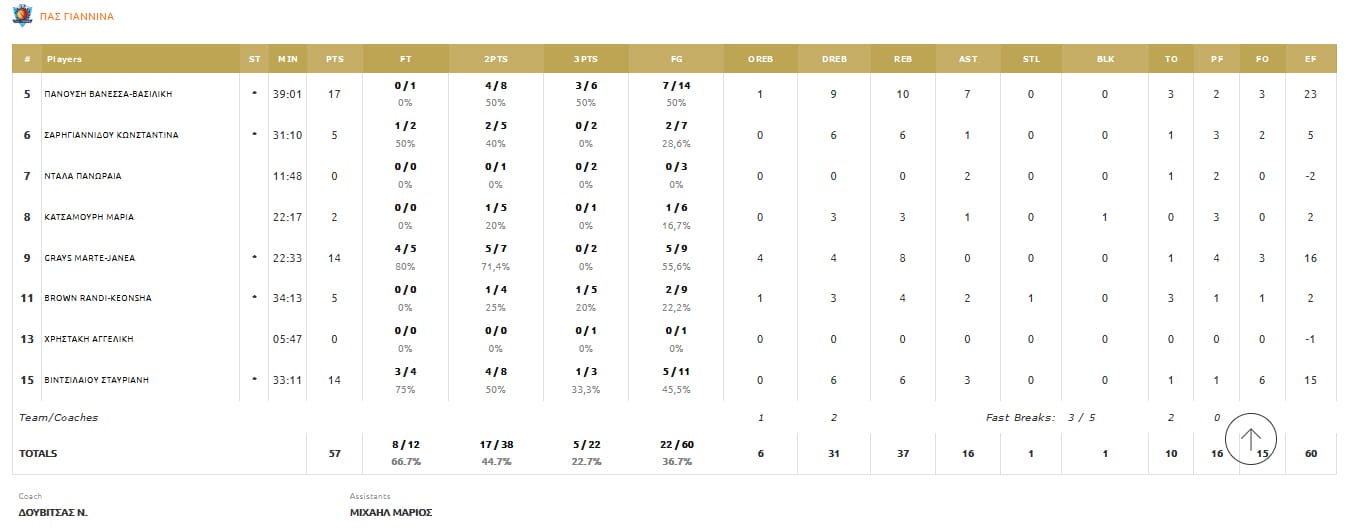 ΠΑΣ Γιάννινα (Δουβίτσας): Πανούση 17(3), Σαρηγιαννίδου 5, Ντάλλα, Κατσαμούρη 2, Γκρέις 14, Μπράουν 5, Χρηστάκη, Βιντσιλαίου Σ. 14(1).