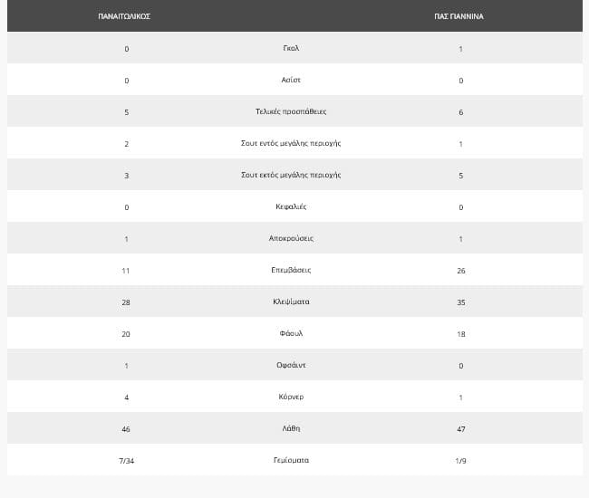 Σχετικά φτωχά τα στατιστικά του παιχνιδιού, με ελαφρώς καλύτερο τον ΠΑΣ Γιάννινα, ο οποίος εν τέλει πήρε και τη νίκη. Η ομάδα του κ. Μεταξά είχε 6 τελικές έναντι 5 του Παναιτωλικού και έκανε περισσότερα κλεψίματα. Οι δύο ομάδες είχαν ίδιο σχεδόν αριθμό λαθών, ενώ ο Παναιτωλικός ήταν η ομάδα που έκανε τα περισσότερα γεμίσματα και η άμυνα του ΠΑΣ τις περισσότερες επεμβάσεις.