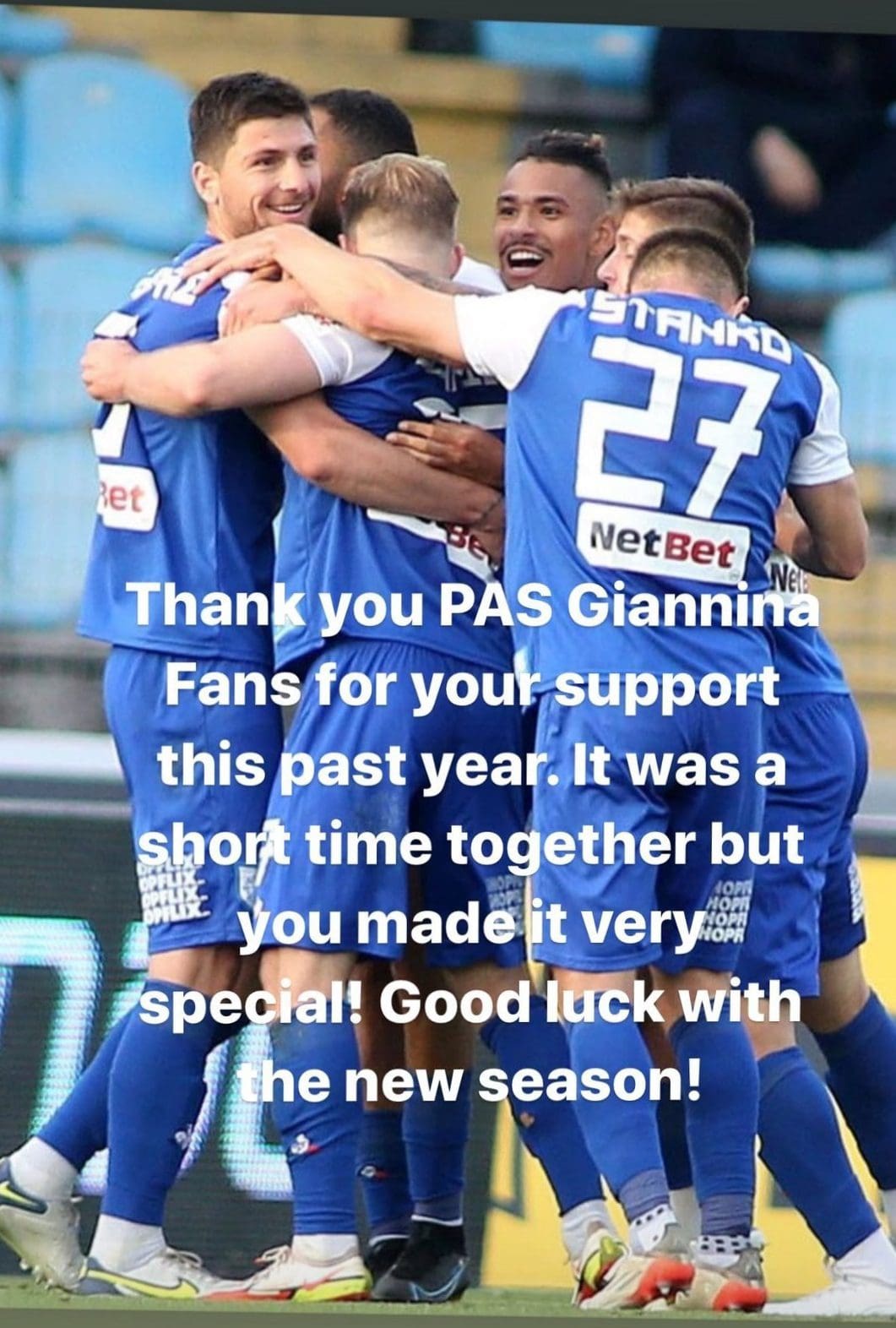 “Ευχαριστώ φίλοι του ΠΑΣ Γιάννινα για την υποστήριξη σας την περασμένη σεζόν. Ήταν λίγος ο χρόνος που περάσαμε μαζί, αλλά τον κάνατε πολύ ξεχωριστό. Καλή επιτυχία τη νέα σεζόν”.